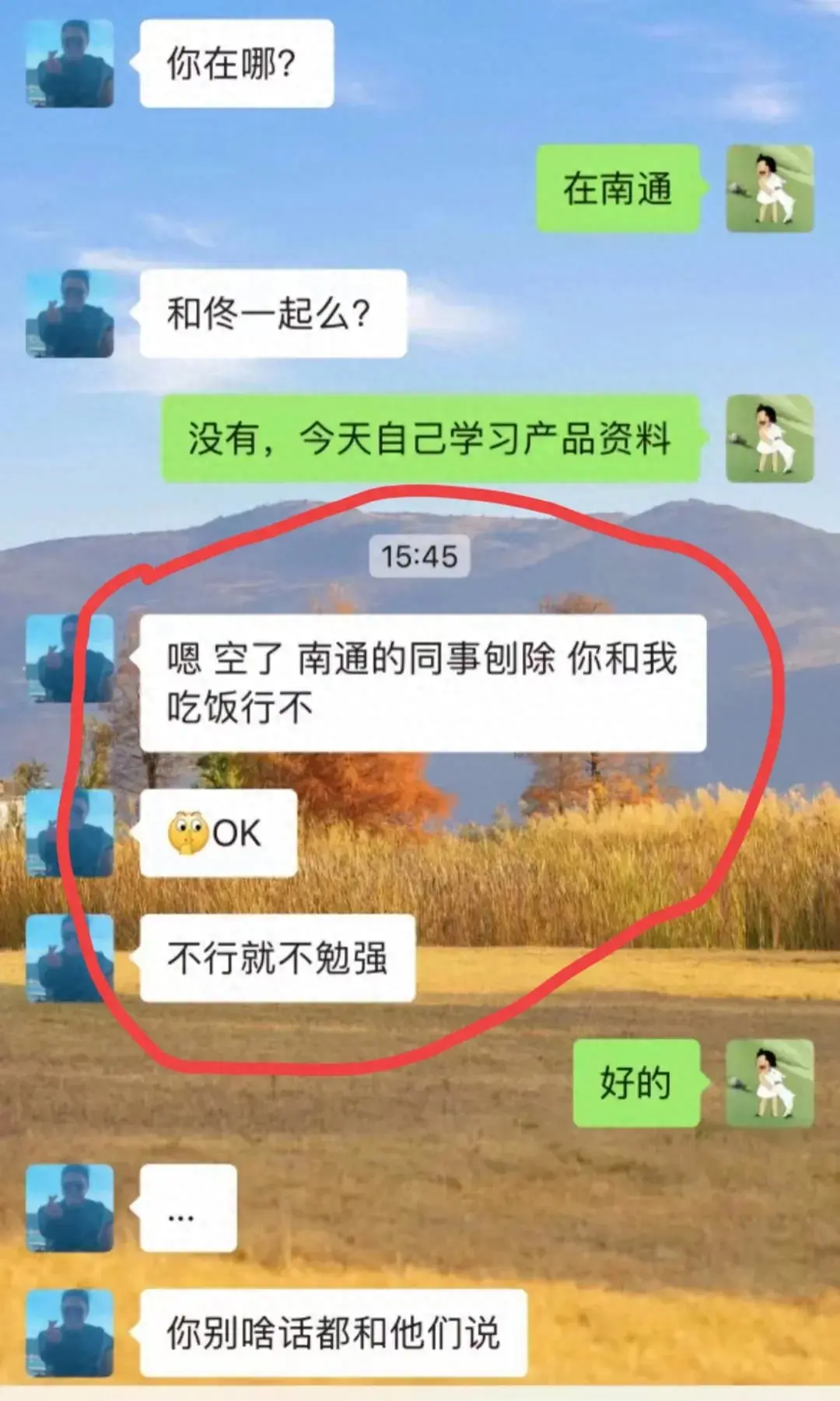这个聊天记录就是南通OK哥和女员工的聊天记录,ok哥的风格真的是很生猛,单刀直入,先用吃饭的名义约女员工吃饭,再不停的暗示女员工这次吃饭不要告诉其他人,特意提到了就“你和我”两个人。