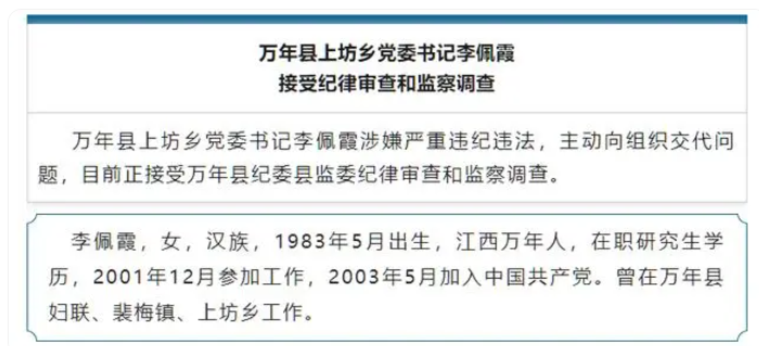 记者注意到,6月17日,上饶市纪委监委官方微信公众号曾发布李佩霞被查的消息。消息称,万年县上坊乡党委书记李佩霞涉嫌严重违纪违法,主动向组织交代问题,目前正接受万年县纪委县监委纪律审查和监察调查。公布的简历显示,李佩霞,女,汉族,1983年5月出生,江西万年人,在职研究生学历,2001年12月参加工作,2003年5月加入中国共产党,曾在万年县妇联、裴梅镇、上坊乡工作。