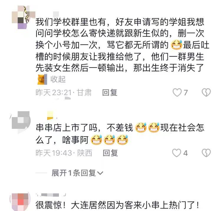 很震惊,这次居然因为一个小小的串串店,又上热门了。其实我们学校群里也有,好友申请写的学姐我想问问学校怎么寄快递就跟新生似的,删一次换个小号加一次,骂它都无所谓的,最后吐槽的时候朋友让我推给他了,他们一群男生先装女生然后一顿输出,那人终于消失了。