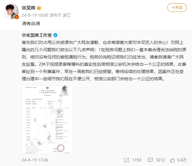 8月19日,某自媒体在社交账号晒出多张聊天记录截图 ,暗示因电视剧《庆余年》成名的演员张H唯涉嫌逃税及涉嫌组织卖淫 。这条指名道姓的大尺度爆料发出后,立刻登上热搜榜,引发网友热议。